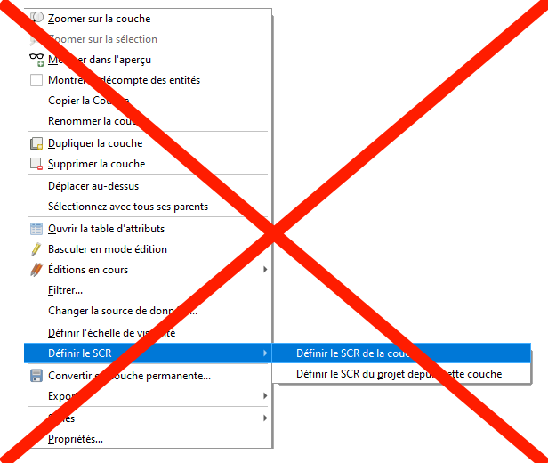 Vous ne devez pas utiliser l’option Définir le SCR de la couche. Cette façon de faire ne devrait être utilisée que lorsque votre couche ne s’affiche pas au bon endroit.